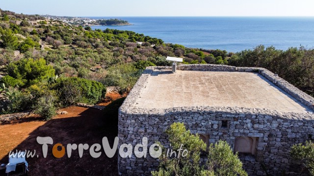 Villetta completamente rivestita in pietra, una vista spettacolare sull’azzurro del mare del Salento, un ambiente tranquillo, circondato da uliveti, fichi d’india e vigneti, per la vostra vacanza in uno dei posti più belli della Puglia.