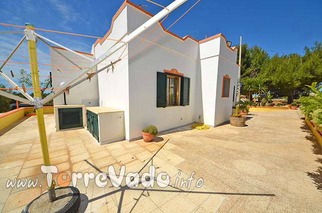 Villetta in campagna di 99 mq. con ampio giardino,terrazzo con vista mare,3 camere da letto (6 posti letto),cucina,angolo cottura,bagno,doccia esterna ed interna con acqua calda,barbecue e posto auto.La nostra villetta dista 550 m. dal centro abitato,600 m. dalle spiagge circostanti attrezzate e libere,1 km dalla fantastica spiaggia attrezzata Lido "LE MALDIVE DEL SALENTO" e 2 km. dalla bellissima marina di Torre Vado con mercati serali,teatri e concerti all'aperto e divertimento per grandi e piccoli.